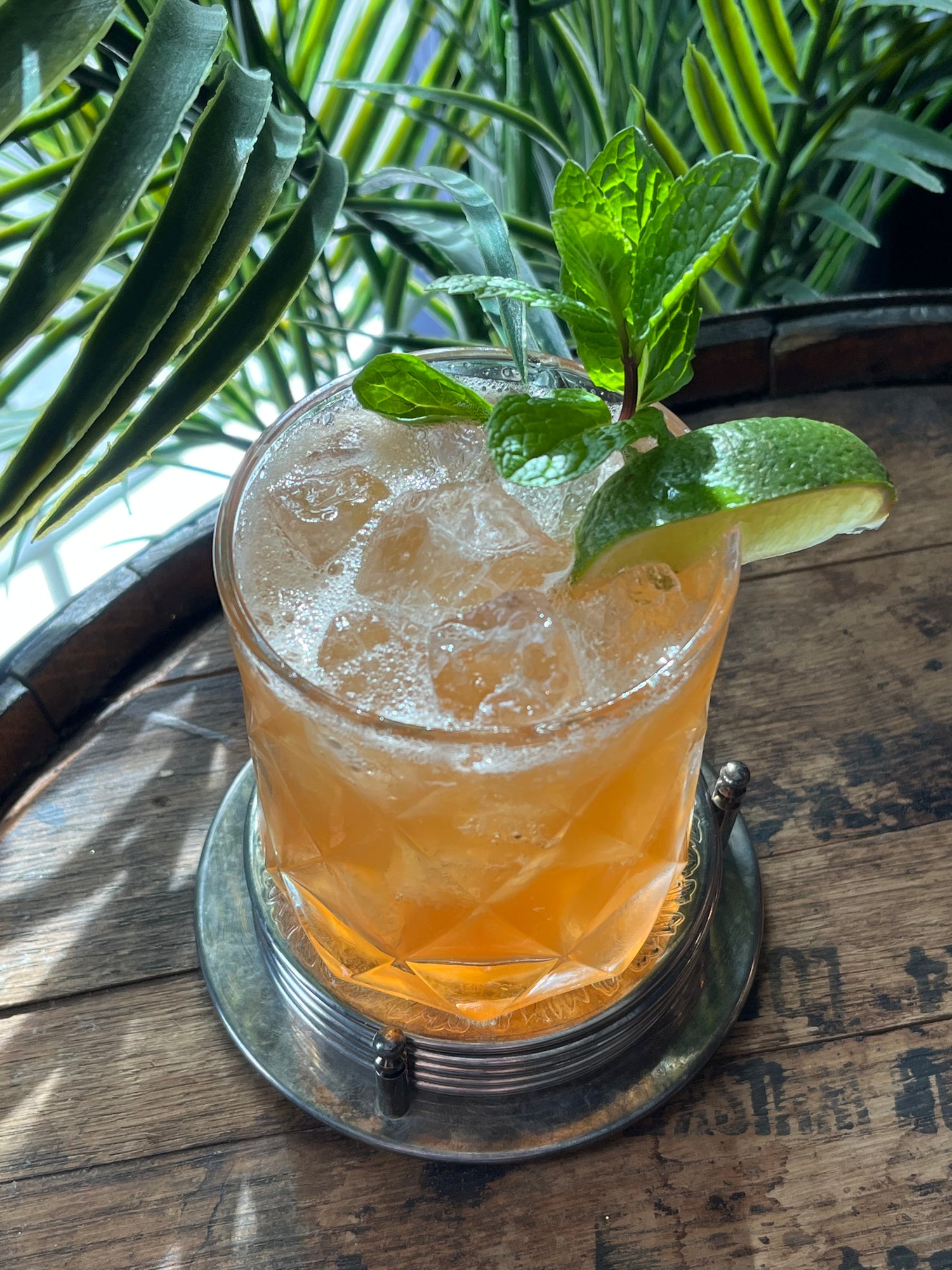 Add all ingredients to a cocktail tin, add ice and shake. Strain into a rocks glass filled with crushed ice. Garnish with a lime and a mint sprig.