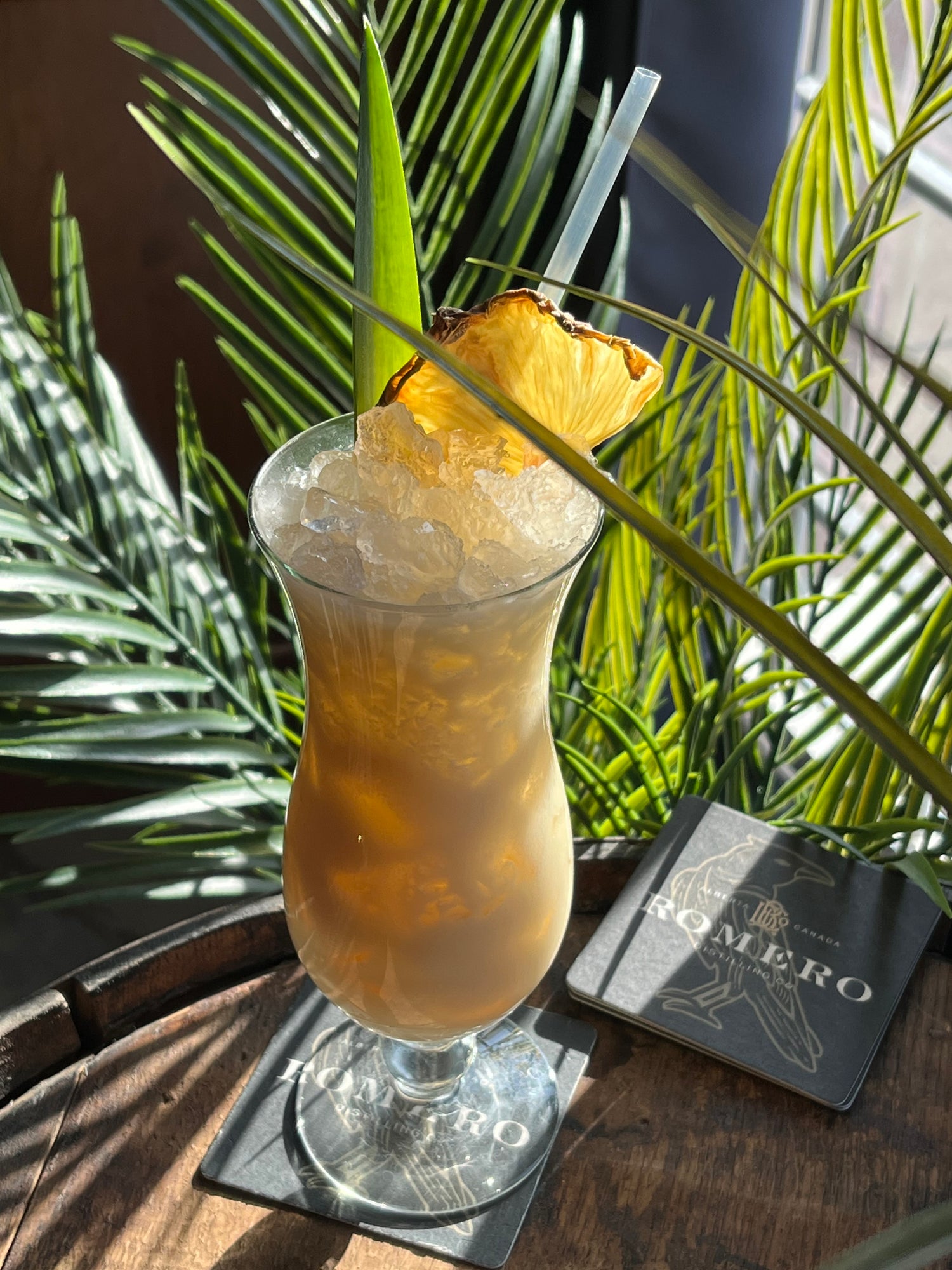 Add all ingredients to a cocktail shaker, fill with ice and shake. Pour all contents of the shaker into a hurricane glass and garnish with a dehydrated (or fresh) pineapple and a pineapple frond.